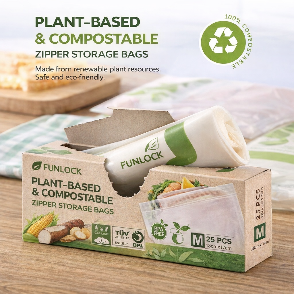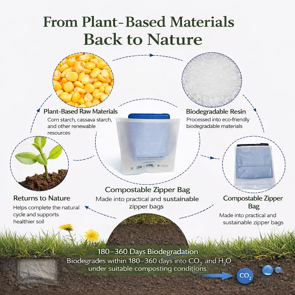Our compostable zipper bags are manufactured using a balanced blend of PLA (Polylactic Acid) and PBAT to achieve both environmental sustainability and reliable performance. PLA is a plant-based material derived from renewable resources such as corn starch, while PBAT enhances flexibility, durability, and resistance to tearing—resulting in a material that is both practical and environmentally responsible.