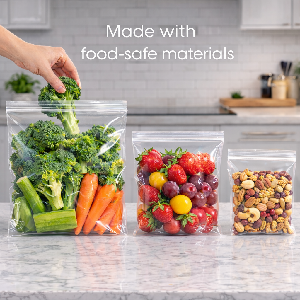 The plastic resin used in production meets FDA requirements for materials intended for food contact, making our bags suitable for direct contact with a wide range of foods including fruits, vegetables, meats, snacks, and prepared meals.
